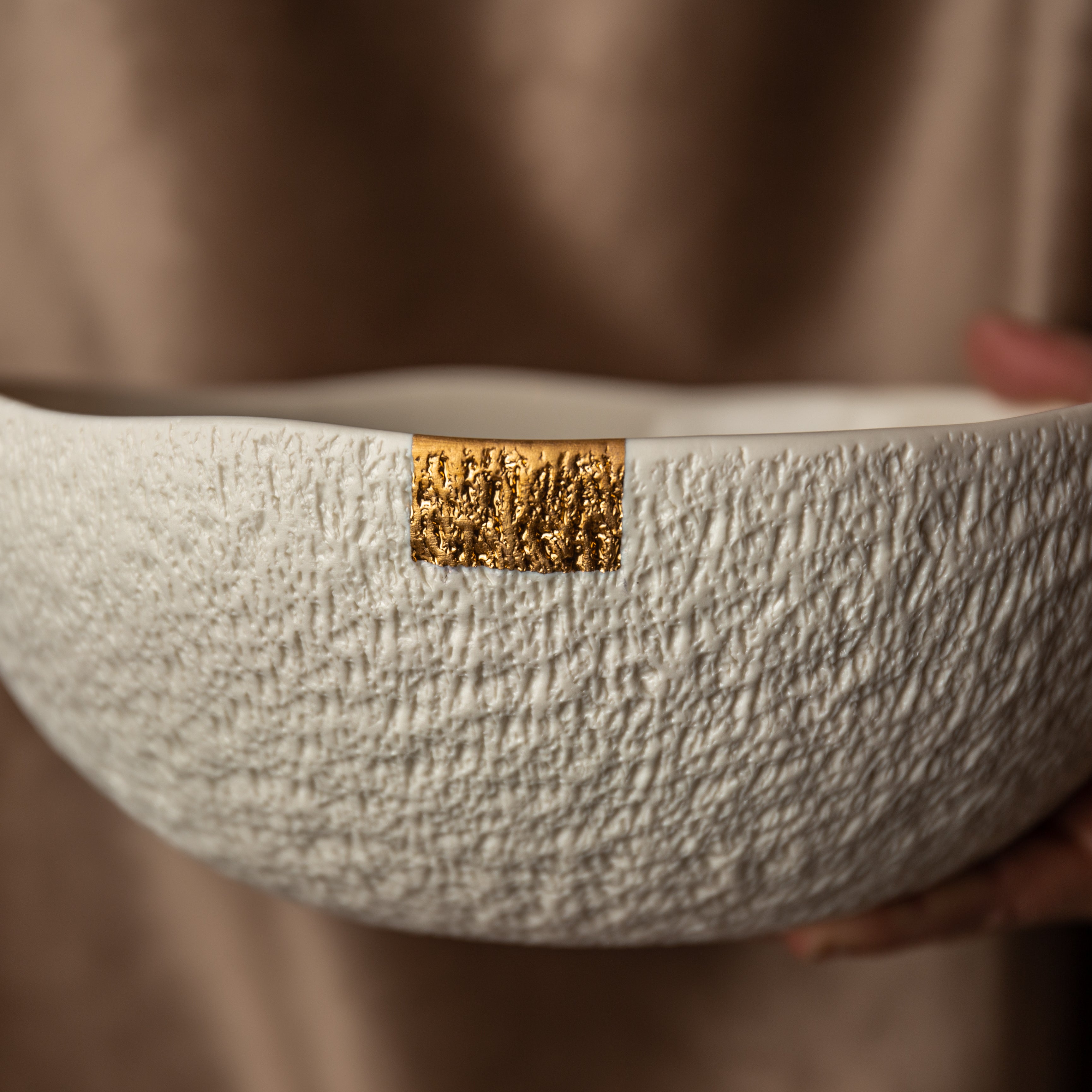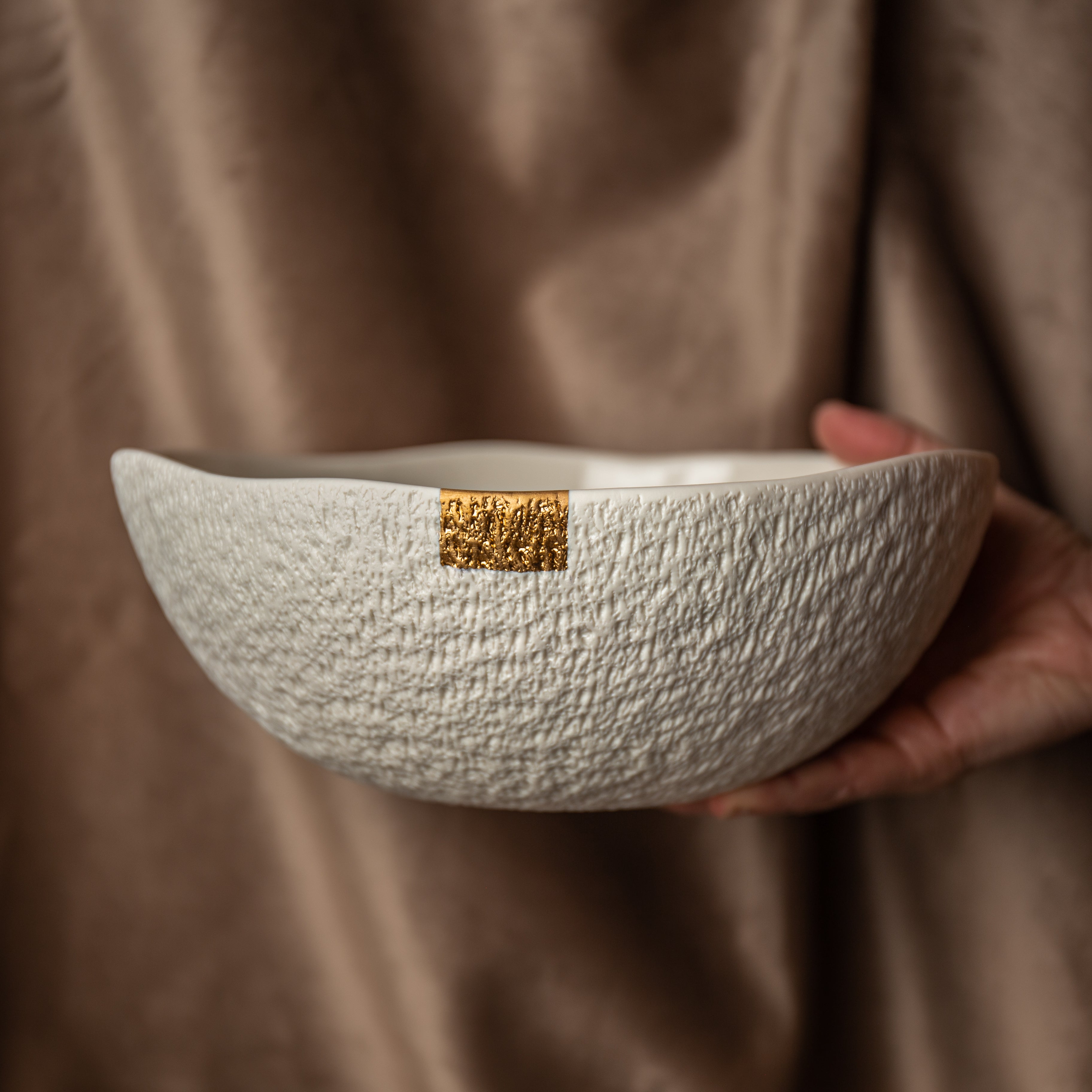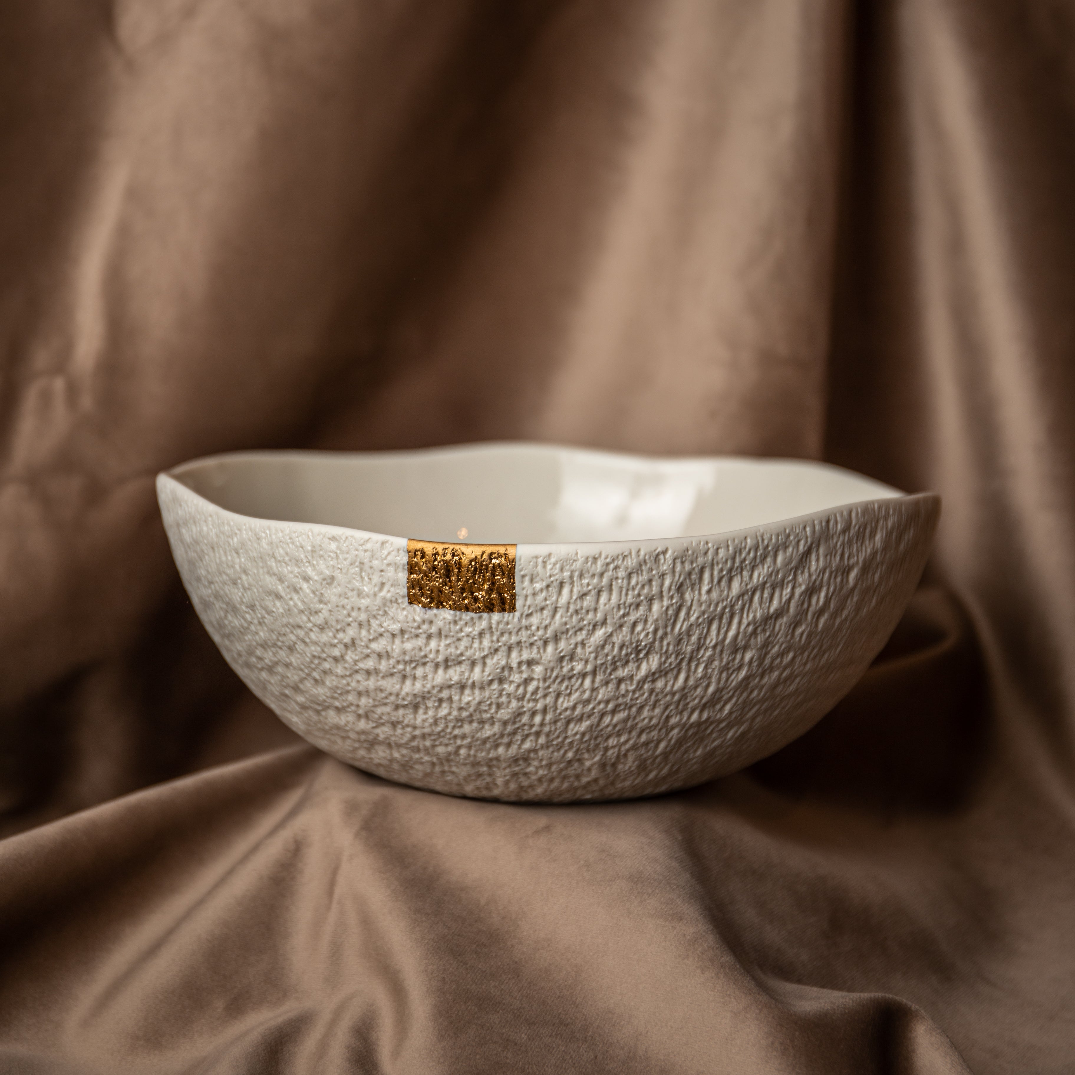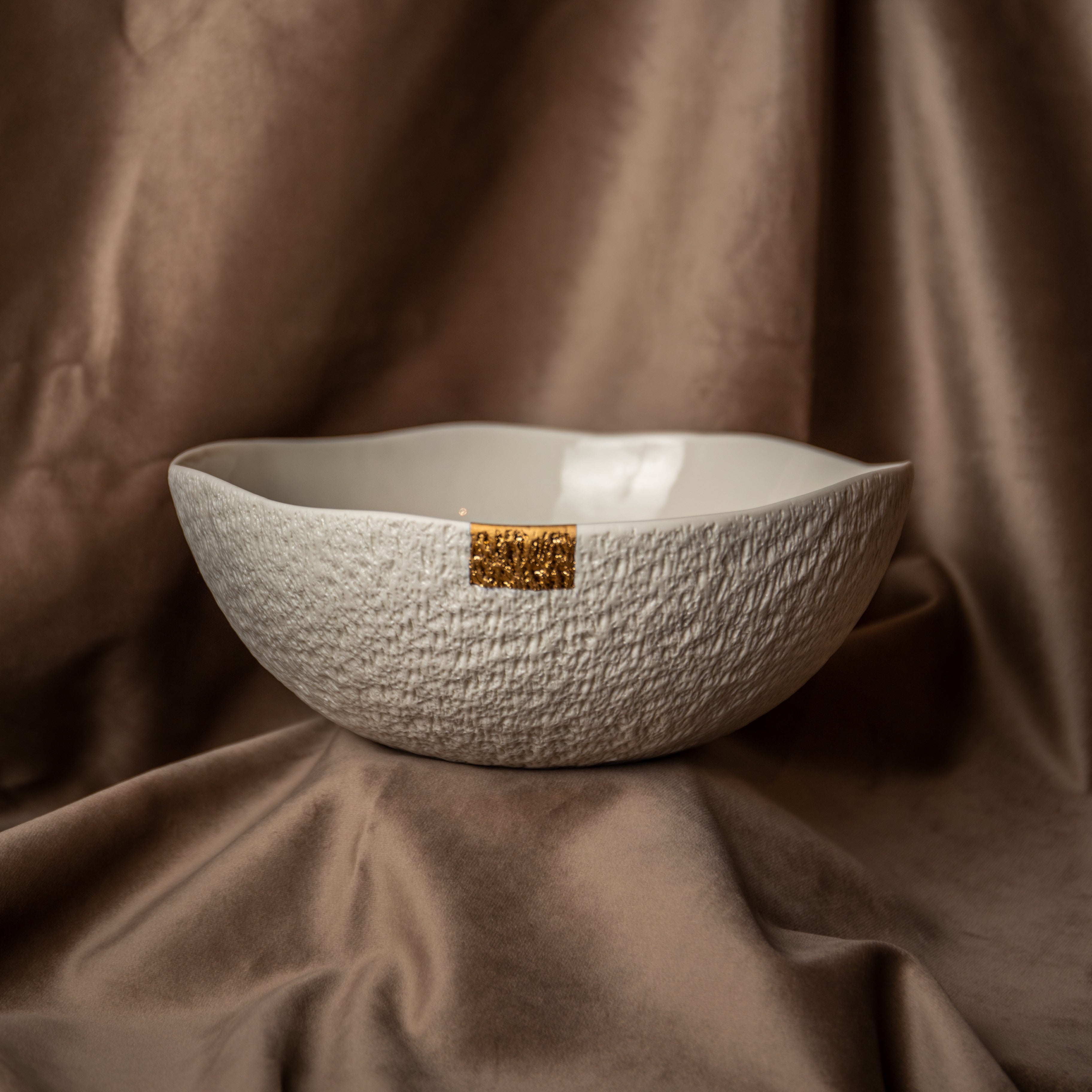 Ovo je najveći komad ove kolekcije. Lepota i delikatnost ručno izvedenog rezbarenja se ovde najlepše vide. Kao i tanjir za posluženje iz ove kolekcije, činija ima dovoljno prostora za diskretan zlatni ukras.