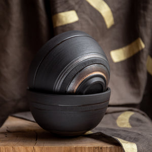 Ručno oblikovana od tamne kamenine, činija ima mat crnu površinu sa suptilnim metalik bronzanim tonovima pri osnovi. Blagi horizontalni žlebovi prate njenu formu i daju joj tiho kretanje. Uz njih, fine uspravne rezbarije — svaka pažljivo urezana rukom — donose ritam i prisustvo, poput tihih poteza četkice u glini. Unutrašnjost je blago teksturisana i čuva trag dodira: otiske prstiju, pokreta i namere. Odlično zadržava toplotu i poziva da usporimo — baš kao i trenuci koje delimo za stolom.